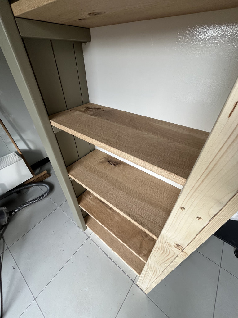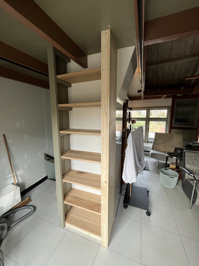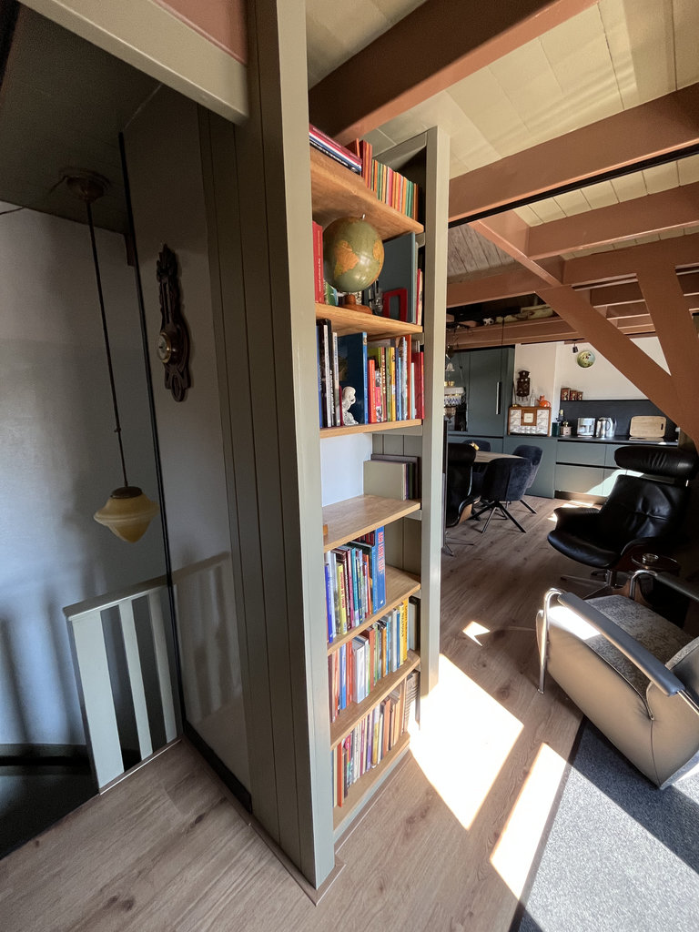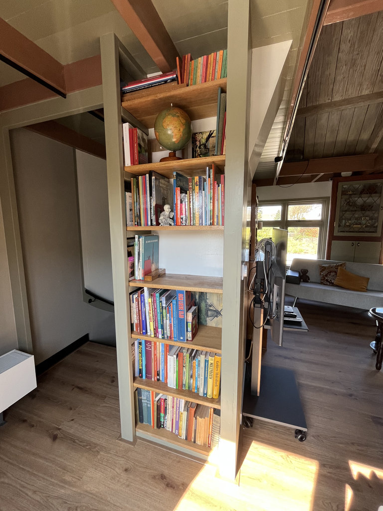 Binnen mocht ik ook aan de slag. De wens: een vaste boekenkast die aansluit bij de stijl van de woning. Omdat de zijkant van de kast dienst moest doen als drager van een glazen deur, is deze extra stevig uitgevoerd. De zijwanden zijn in kleur meegeverfd met het bestaande houtwerk, terwijl eiken planken met olie-afwerking zorgen voor een warm contrast.