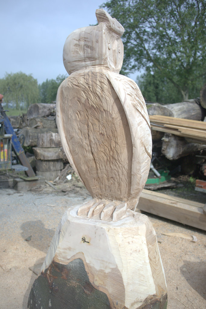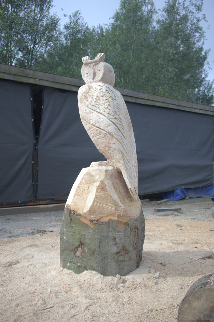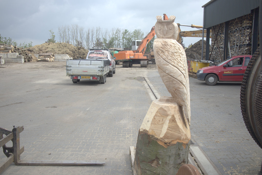 Uit de hoofdstam zaagde en beeldhouwde ik een uil, die straks als herinnering weer in het park wordt geplaatst. Zo leeft het verhaal van de boom voort in een nieuw object.