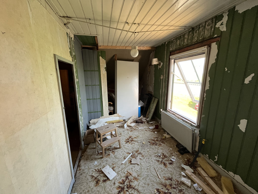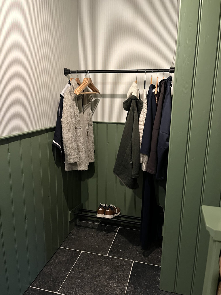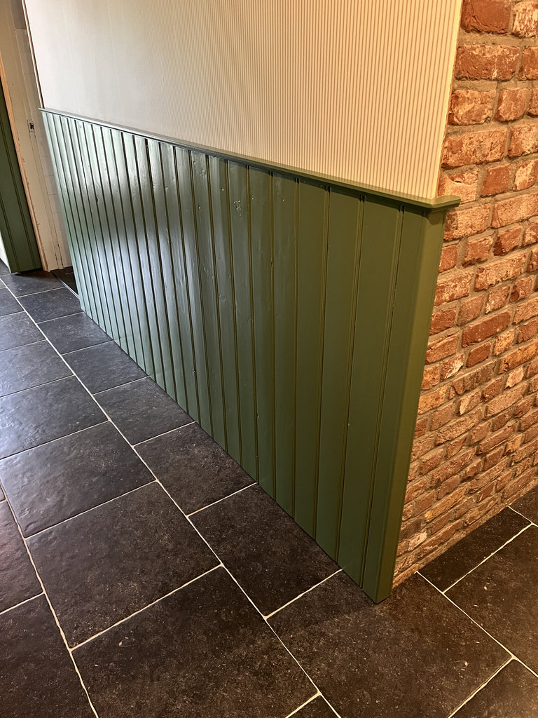 Na schoonmaken en schuren heb ik de planken verwerkt tot lambrisering in de gang. Afgelakt in een historische groene kleur passen ze perfect bij het karakter van de woning.