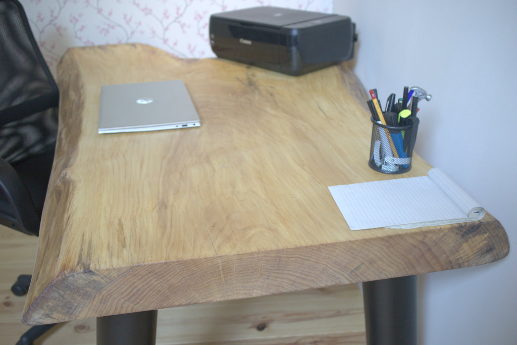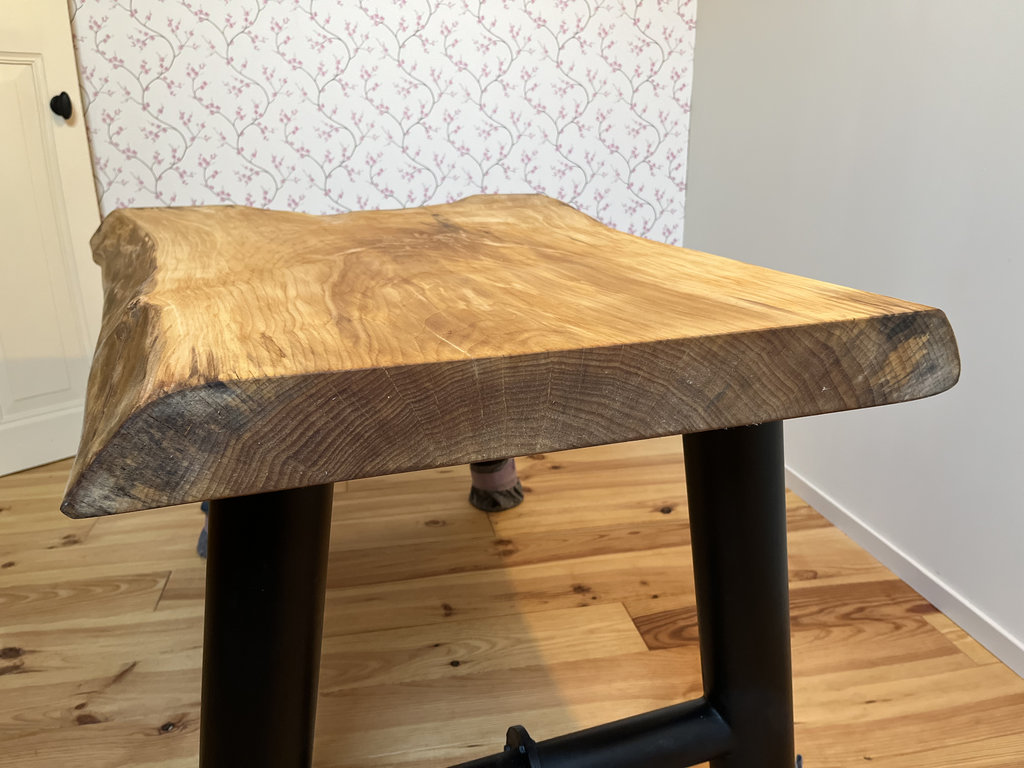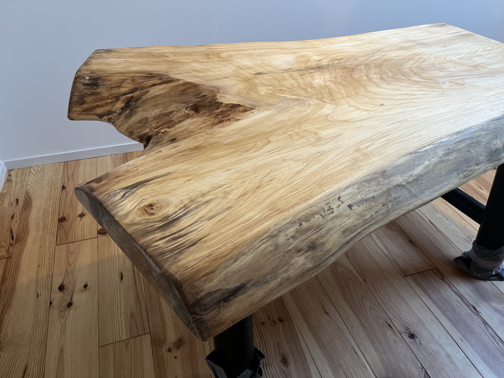 Dit bureau is gemaakt van een lokaal gekapte Populier. Het blad bestaat uit 1 stuk, heeft een dikte van 8 cm en is afgewerkt met naturel olie. Het stalen frame is zwart gepoedercoat.