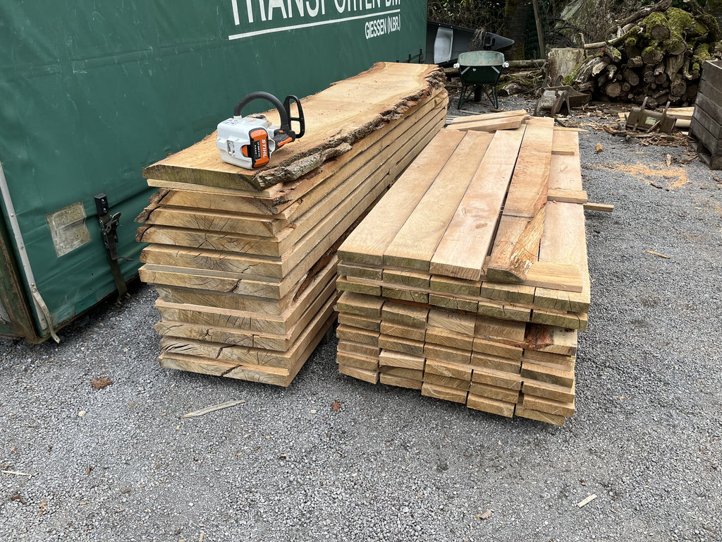 Ik heb geholpen met het vervoeren en keuren van de stam en met de aanmelding bij de Nederlandse Rondhoutveiling. De onderste vijf meter is daar verkocht, zodat de stichting een deel van de kosten kon terugverdienen. Het resterende hout heb ik verzaagd tot planken die nu liggen te drogen – klaar voor nieuwe plannen in de tuin.