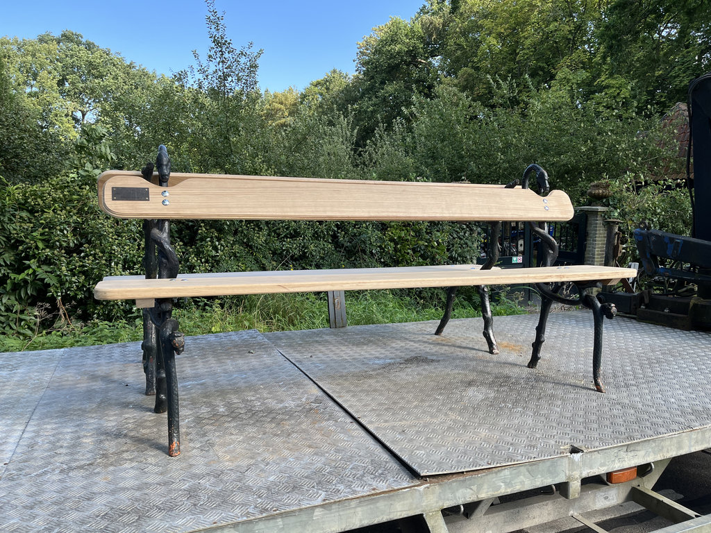 Een aantal banken in de kasteeltuin zijn geschonken door mensen die deze tuin en de omgeving ervan een warm hardt toedragen. Twee van deze bestaande gietijzeren banken, voorzien van bijzondere slangenkoppen, mocht ik opknappen. Met nieuw eikenhout uit eigen voorraad zijn ze weer stevig en mooi, zodat bezoekers er nog vele jaren gebruik van kunnen maken.